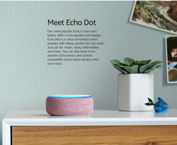- Meet Echo Dot – Our most popular smart speaker with a fabric design. It is our most compact smart speaker that fits perfectly into small spaces.